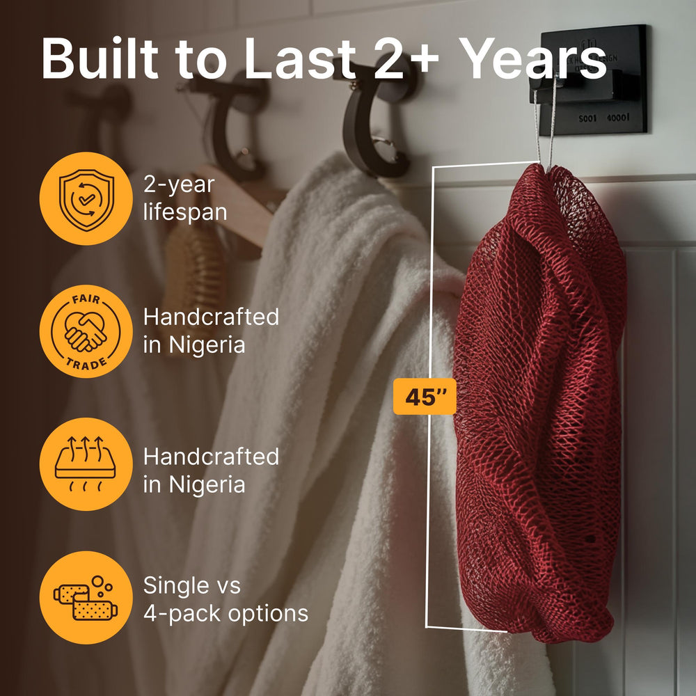 Experience the traditional African bath ritual with our Authentic African Net Sponge, handcrafted in Nigeria using 100% high-quality nylon. This long, stretchy exfoliating net is a cultural essential across West Africa, loved for its ability to deeply cleanse, exfoliate, and leave the skin impossibly smooth.Unlike regular loofahs or washcloths, the African Net Sponge lathers beautifully, dries quickly, lasts for months, and reaches every part of your body, including your back with ease. It removes dead skin cells, boosts circulation, and helps unclog pores for a soft, radiant, healthier-looking skin tone.